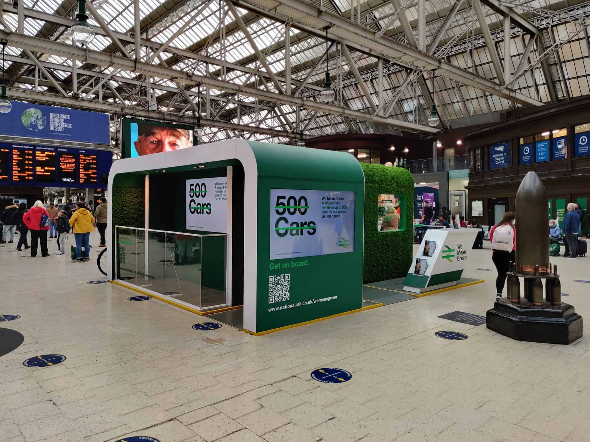 We worked with Leading Edge in association with COP26 (Conference of the Parties) : The global climate summit welcomed world leaders, activists and delegates from all over the world, wrapping up in Glasgow November 2021. The conference was an incredibly complex event hosted by Scotland and the UK. Originally scheduled for 2020, COP26 was postponed in response to COVID-19, giving organisers, the United Nations, the UK Government and the host city time to redesign operational plans. Glasgow Central railway station welcomed COP26 attendees and passengers with a campaign that enabled them to showcase the rail industry’s green achievements. Those who attended were able to enjoy driving a train simulator at the Rail Delivery Group’s (RDG) green and sustainable stand, and Bigabox were given the opportunity to deliver and operate our 2.6mm LED video within this incredible stand. The campaign, titled ‘We Mean Green’ has been organised by RDG, and their objective is for us to learn more about how the rail industry intends to encourage getting more people and goods onto trains and off of the roads in a bid to help in the fight against climate change.