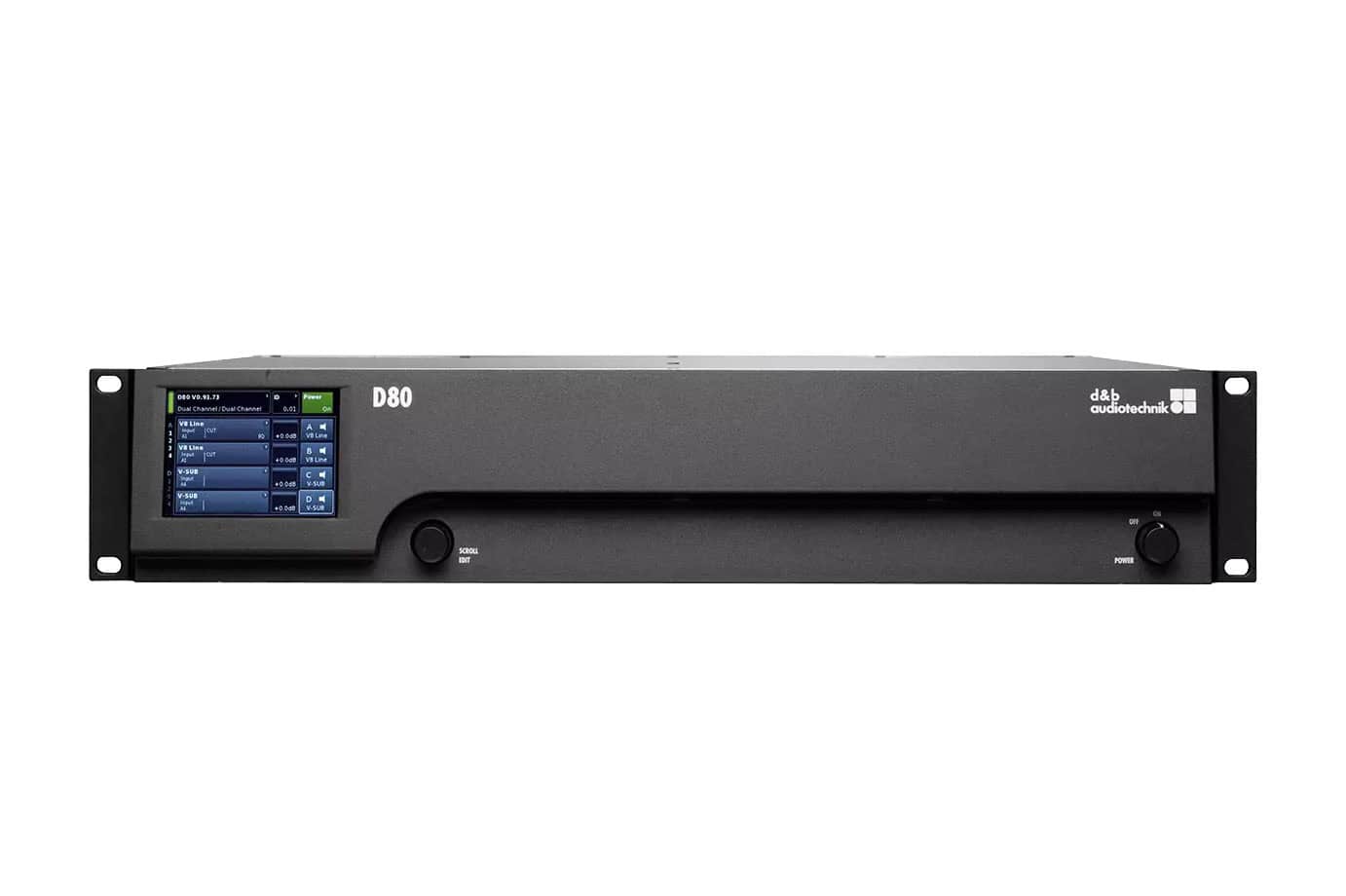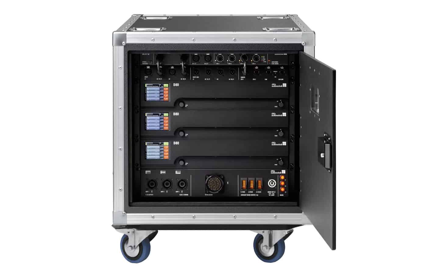 If you are looking for Premium Audio Systems for Events, the 2 RU four channel D80 amplifier is a high power density amplifier. Ideally suited for use in both mobile and installation environments. It contains configurations for all d&b loudspeakers and a linear mode. It’s signal delay capability enables user definable settings of up to 10 s (= 3440 m/11286 ft) to be applied independently to each channel. The same applies to the two 16-band equalizers, providing optional parametric, asymmetric, shelving or notch filtering. The D80 incorporates a colour TFT touchscreen. Offering quick access to the menu structure, while the rotary encoder can be used for fine adjustment. The front panel and the integrated touchscreen of the D80 amplifier is tilted up for ease of operation when the amplifier is below eye level.