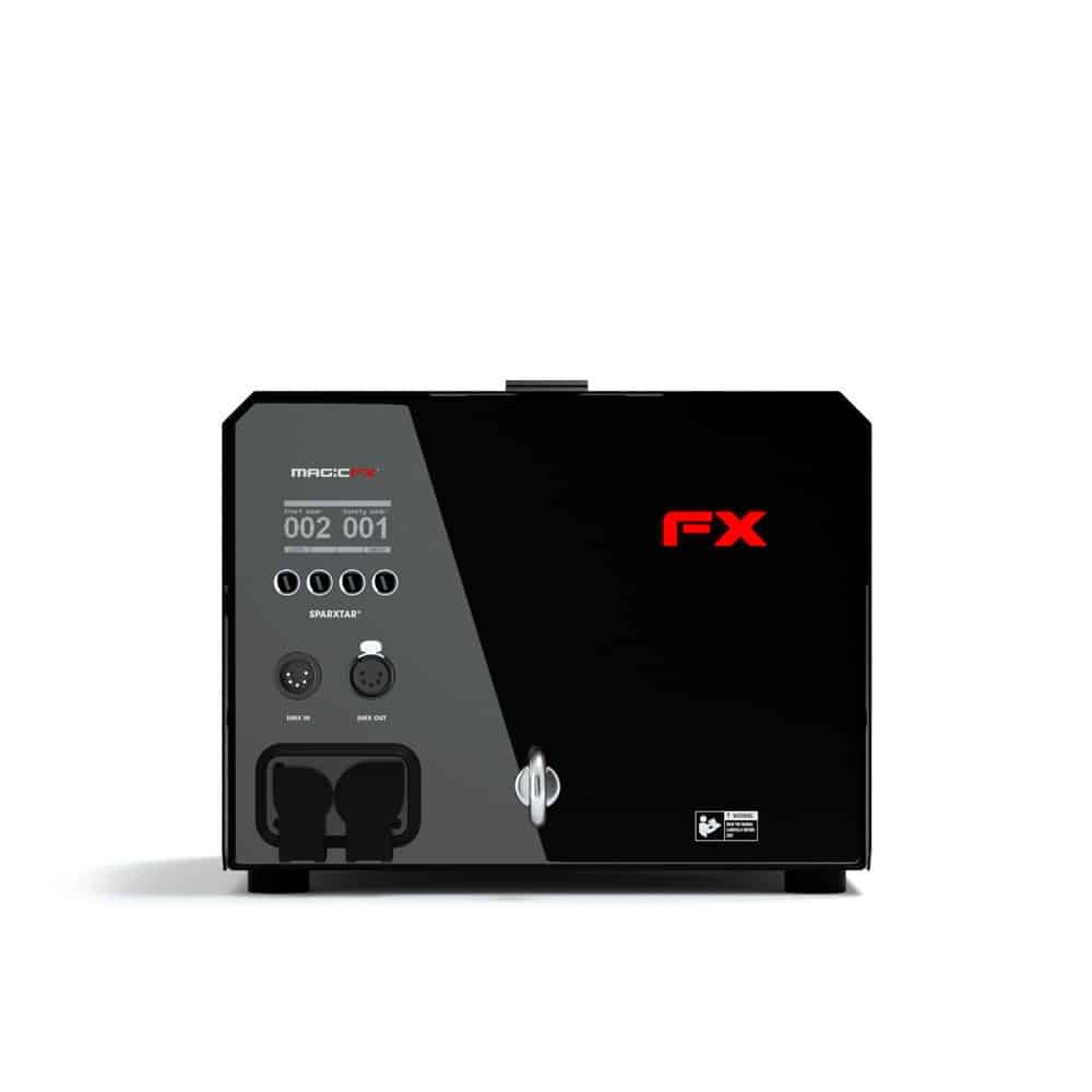 The MAGICFX® SPARXTAR is a special effects machine for controlled emission of sparks into the air. The machine transports MAGICFX® SPARXTAR Powder from the hopper through an internal heater and blows the resulting sparks upwards through the output pipe. The maximum continuous duration of the effect is 40 seconds. After this period the effect will stop automatically. With a full hopper a MAGICFX® SPARXTAR can deliver sparks for a total duration of 9 up to 17 minutes (depending on the set effect height). The MAGICFX® SPARXTAR is outfitted for operation: • with DMX and RDM; • in sequence with multiple machines.