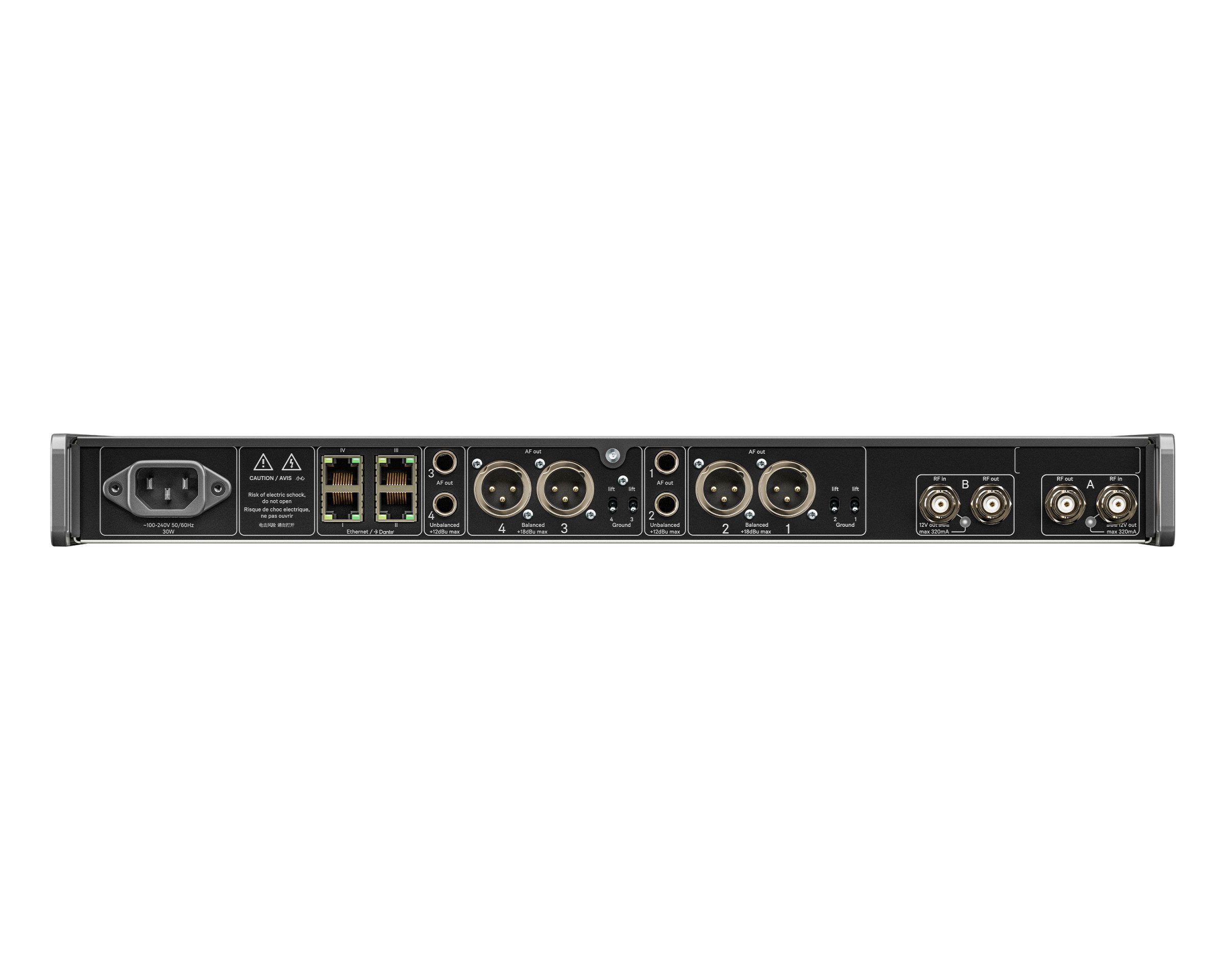 Four-channel digital full-rack (19″) receiver with internal PSU and Dante® for use with Evolution Wireless Digital handheld, bodypack and tablestand transmitters. Extended 88 MHz switching bandwidth, intermodulation-free operation [intermodulation-free equidistant channel spacing] for up to 293 channels with secure AES 256 encryption and four modular network ports.